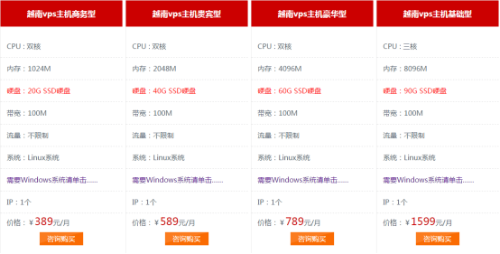 其次,說(shuō)一下越南vps的價(jià)格優(yōu)勢(shì)。越南vps價(jià)格還算挺便宜,就拿宇塵網(wǎng)絡(luò)越南vps來(lái)說(shuō),CPU:雙核 內(nèi)存:1G 硬盤(pán):20 G SSD 帶寬:100M IP:1個(gè) 價(jià)格為每月389元,且支持Linux和Windows系統(tǒng)的,相較于其他vps或者越南服務(wù)器而言,價(jià)格還算非常優(yōu)惠的,且適用范圍廣,能滿(mǎn)足大部分企業(yè)的需求。