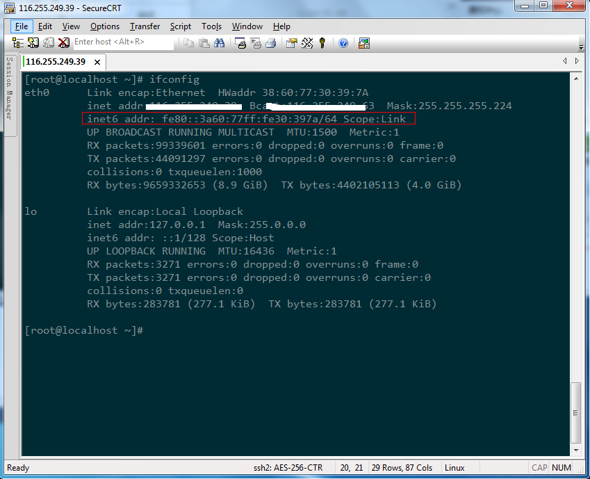 注釋:有 “inet6 addr:。。。。。。。” 的表示開啟了IPv6功能