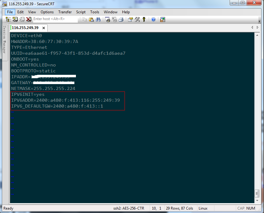 IPV6ADDR=2400:a480:f:413:116:255:249:39----填寫服務(wù)器IPv6地址。