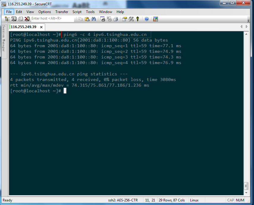a) 輸入以下命令進行測試:ping6 -c 4 ipv6.tsinghua.edu.cn