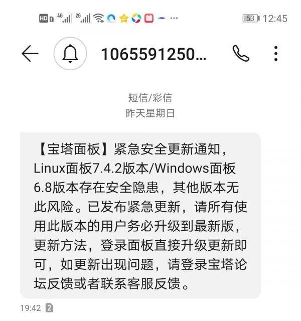 8月23日19點42分我收到的短信內(nèi)容如下:【寶塔面板】緊急安全更新通知,Linux面板7.4.2版本/Windows面板6.8版本存在安全隱患,其他版本無此風(fēng)險。已發(fā)布緊急更新,請所有使用此版本的用戶務(wù)必升級到最新版,更新方法,登錄面板直接升級更新即可,如更新出現(xiàn)問題,請登錄寶塔論壇反饋或者聯(lián)系客服反饋。