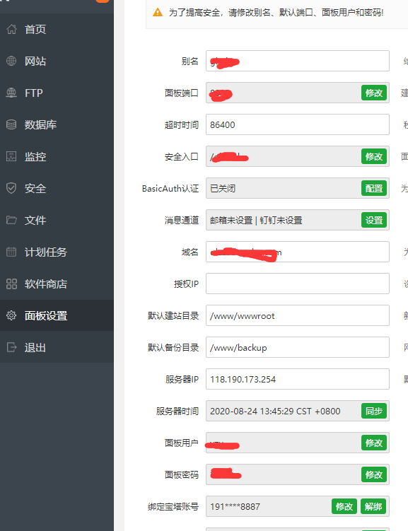 6、面板密碼:這里建議大家修改成一個長一點的帶特殊符號的密碼,那樣別人就不容易爆破解密了。
