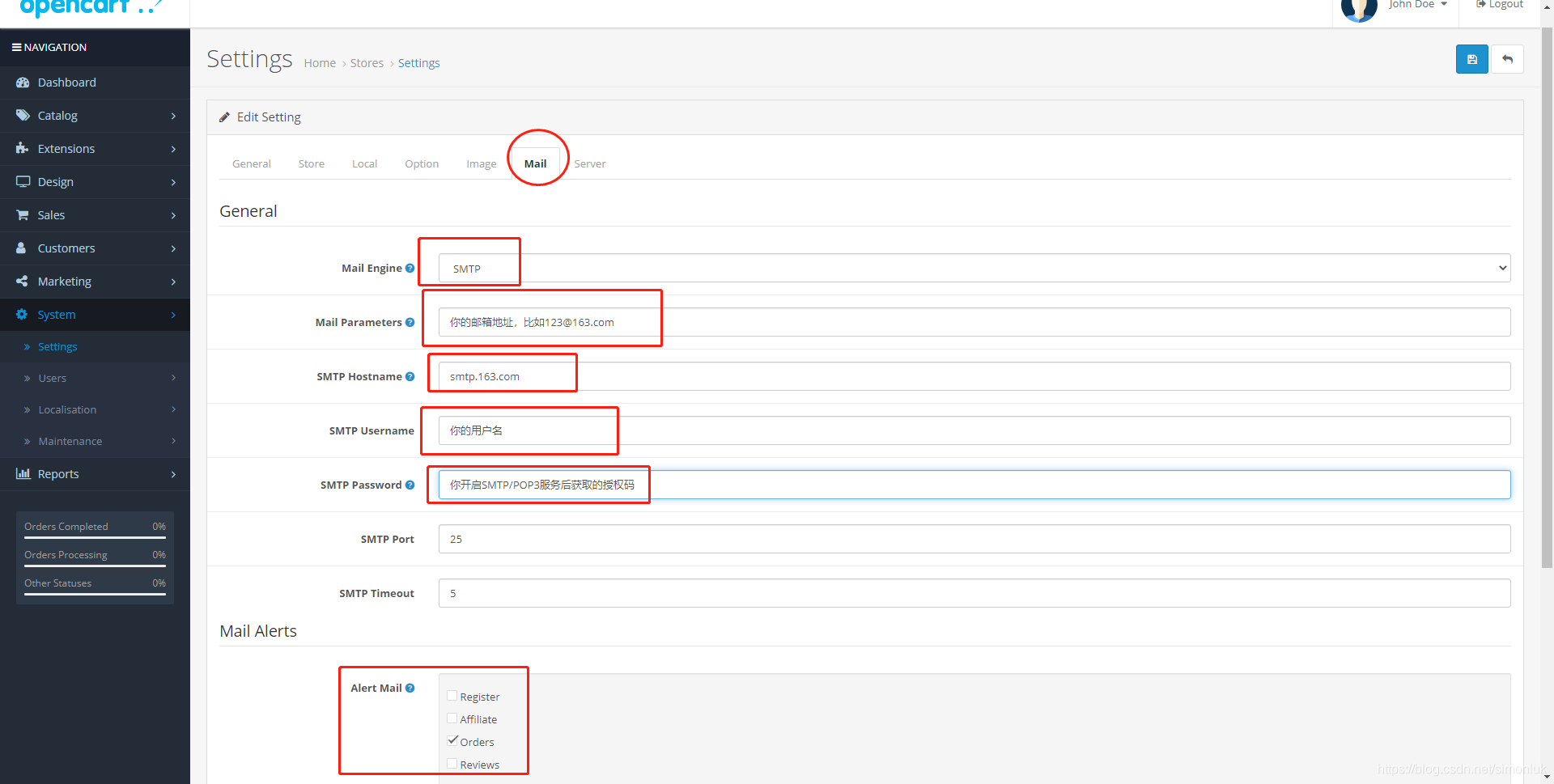 上圖我畫圈的需要配置,Mail Engine一般選SMTP,因為這個不需要服務器的依賴,如果是選Mail,需要服務器安裝發(fā)送郵件的軟件,端口25一般不用動,如果需要ssl協(xié)議你要設置965端口,視具體情況而定設置好郵箱參數(shù)后,下方的Mail Alerts可以設置郵件提醒的類型,第一個Register注冊時提醒,第二個Affiliate有會員加盟時提醒,