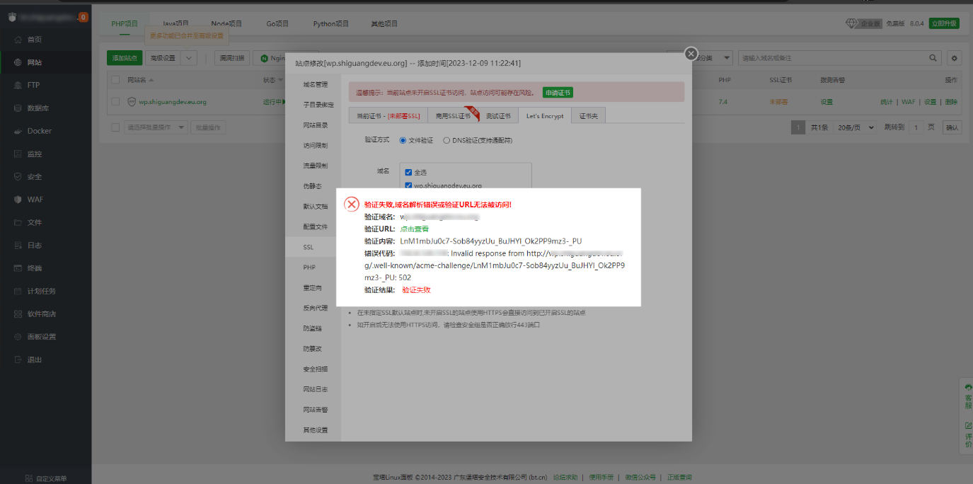 使用寶塔面板建立站點(diǎn),申請(qǐng)let‘s Encrypt 免費(fèi)ssl證書時(shí)提示驗(yàn)證失敗,域名解析錯(cuò)誤或驗(yàn)證URL無(wú)法被訪!