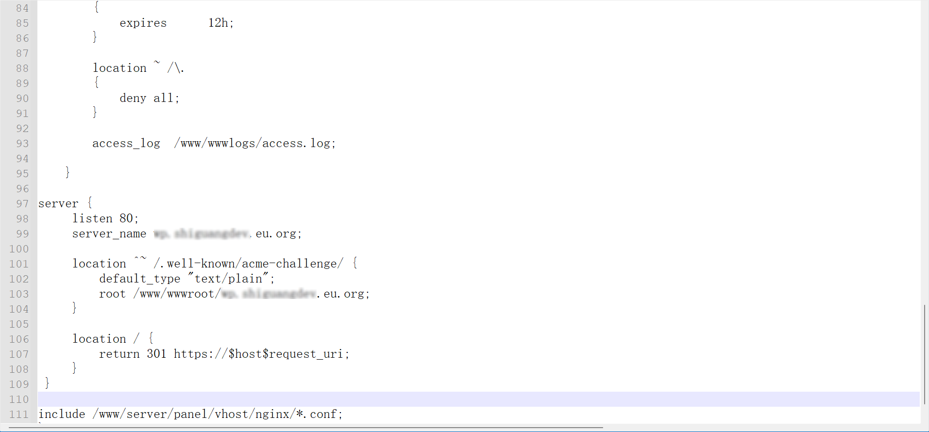 server { listen 80; server_name xxxxx; location ^~ /.well-known/acme-challenge/ { default_type "text/plain"; root /www/wwwroot/xxxx; } location / { return 301 https://$host$request_uri; } }